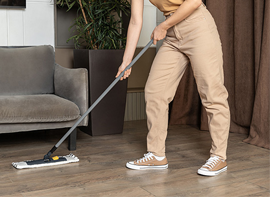 - Плоская швабра Econova – швабра с насадкой из микрофибры эффективно справляется с влажной и сухой уборкой, не оставляя разводов. Выпускается с обычной и телескопической ручкой, позволяющей регулировать высоту. Компактная форма основания (40×10 см) позволяет легко убирать под мебелью.